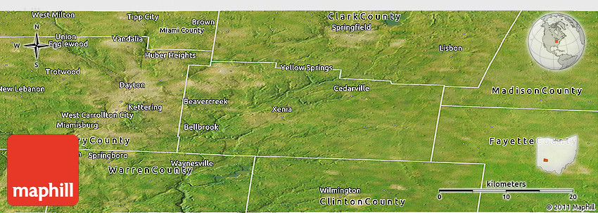 The panoramic satellite map represents one of several map types and styles available. Look at Greene County, Ohio, United States from different perspectives.