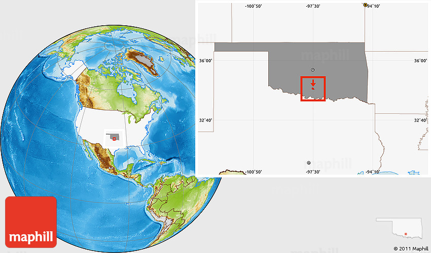 Maphill is a collection of map images. This image combines a physical map with the globe centered on ZIP code 73481. Use the buttons under the image to switch to different map types.