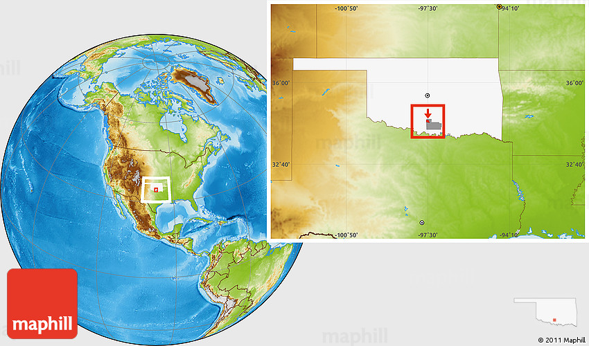 Maphill is a collection of map images. This image combines a physical map with the globe centered on ZIP code 73481. Use the buttons under the image to switch to different map types.