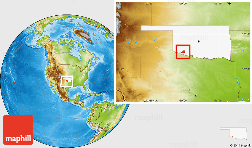 Maphill is a collection of map images. This image combines a physical map with the globe centered on ZIP code 73542. Use the buttons under the image to switch to different map types.