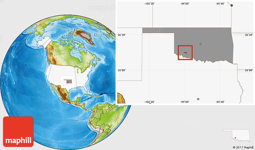Maphill is a collection of map images. This image combines a physical map with the globe centered on ZIP code 73566. Use the buttons under the image to switch to different map types.
