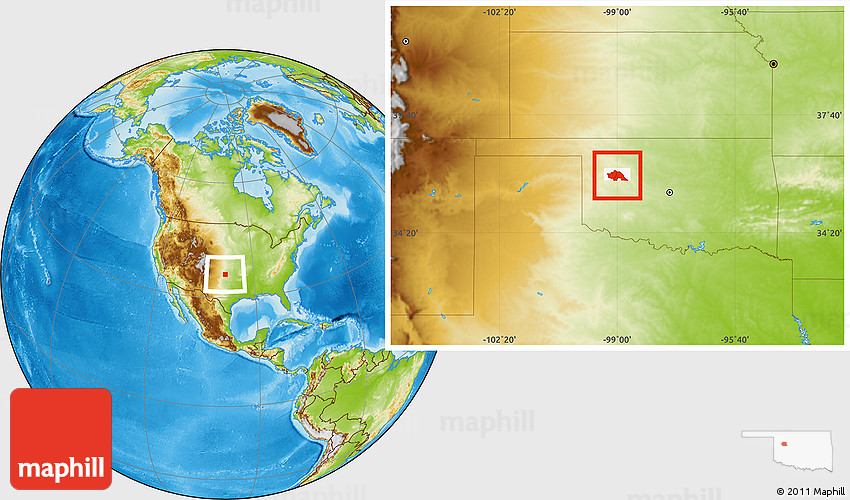 Maphill is a collection of map images. This image combines a physical map with the globe centered on ZIP code 73667. Use the buttons under the image to switch to different map types.