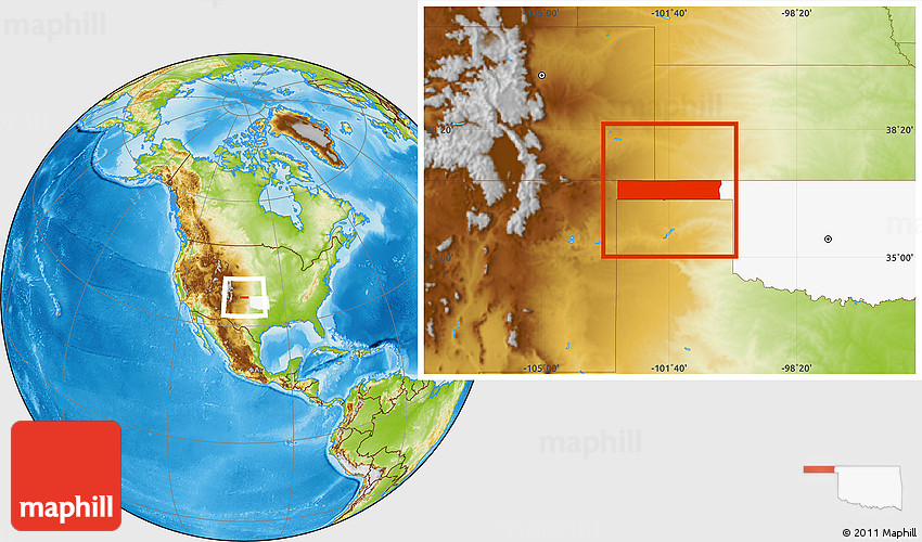 Maphill is a collection of map images. This image combines a physical map with the globe centered on ZIP codes starting with 739. Use the buttons under the image to switch to different map types.