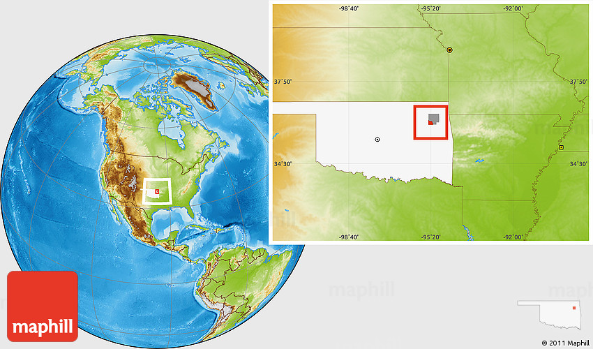 Maphill is a collection of map images. This image combines a physical map with the globe centered on ZIP code 74337. Use the buttons under the image to switch to different map types.