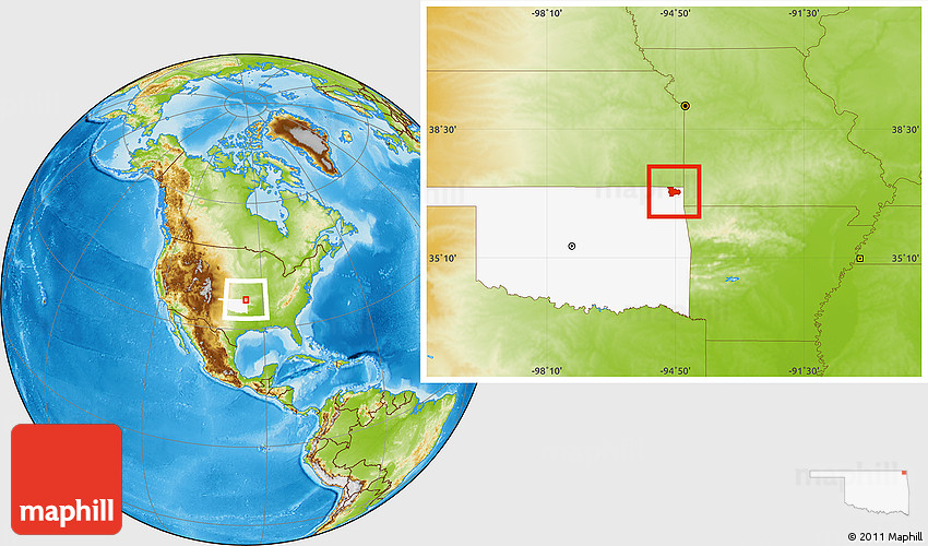 Maphill is a collection of map images. This image combines a physical map with the globe centered on ZIP code 74354. Use the buttons under the image to switch to different map types.