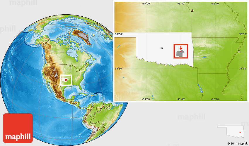 Maphill is a collection of map images. This image combines a physical map with the globe centered on ZIP code 74425. Use the buttons under the image to switch to different map types.