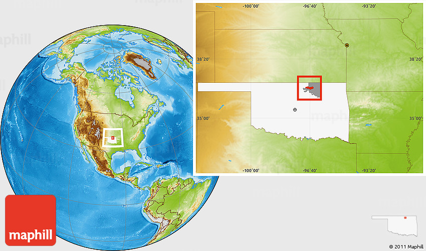 Maphill is a collection of map images. This image combines a physical map with the globe centered on ZIP code 74633. Use the buttons under the image to switch to different map types.