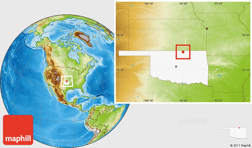 Maphill is a collection of map images. This image combines a physical map with the globe centered on ZIP code 74641. Use the buttons under the image to switch to different map types.
