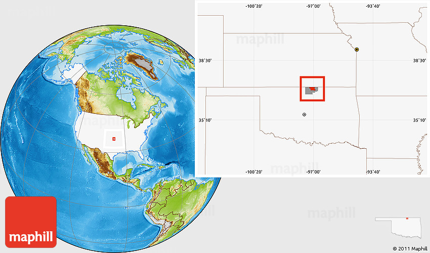 Maphill is a collection of map images. This image combines a physical map with the globe centered on ZIP code 74647. Use the buttons under the image to switch to different map types.
