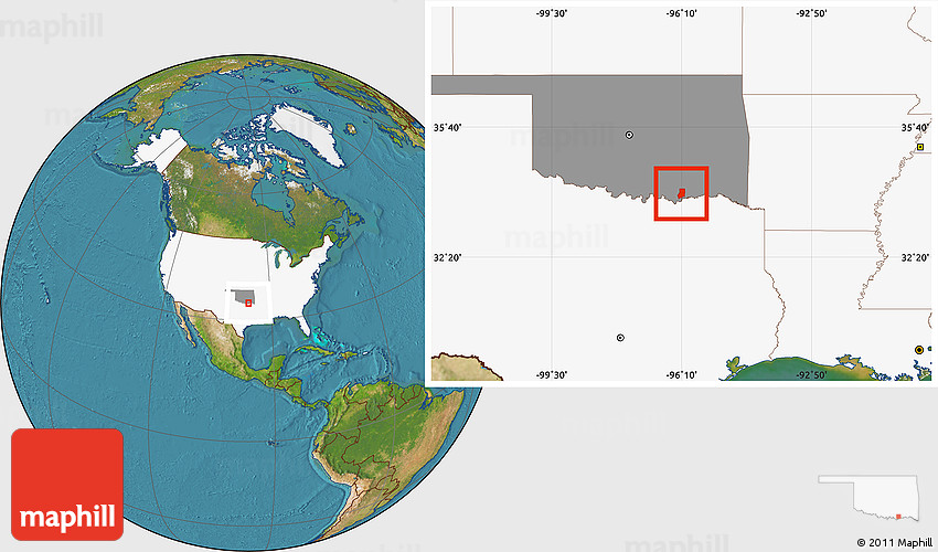 Maphill is a collection of map images. This image combines a satellite map with the globe centered on ZIP code 74726. Use the buttons under the image to switch to different map types.