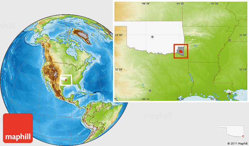 Maphill is a collection of map images. This image combines a physical map with the globe centered on ZIP code 74728. Use the buttons under the image to switch to different map types.