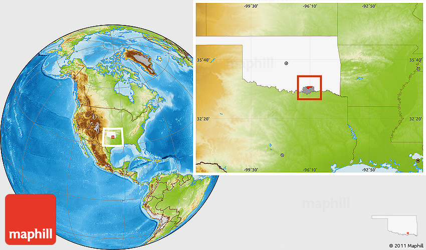 Maphill is a collection of map images. This image combines a physical map with the globe centered on ZIP code 74729. Use the buttons under the image to switch to different map types.