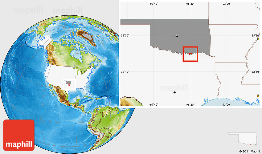 Maphill is a collection of map images. This image combines a physical map with the globe centered on ZIP code 74741. Use the buttons under the image to switch to different map types.