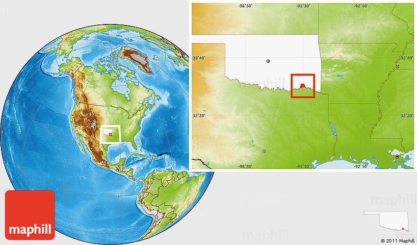 Maphill is a collection of map images. This image combines a physical map with the globe centered on ZIP code 74743. Use the buttons under the image to switch to different map types.