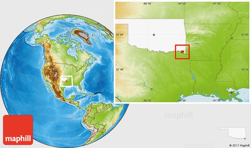 Maphill is a collection of map images. This image combines a physical map with the globe centered on ZIP code 74745. Use the buttons under the image to switch to different map types.