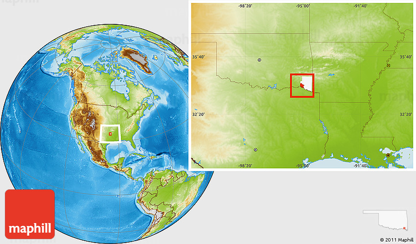 Maphill is a collection of map images. This image combines a physical map with the globe centered on ZIP code 74764. Use the buttons under the image to switch to different map types.