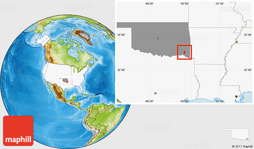 Maphill is a collection of map images. This image combines a physical map with the globe centered on ZIP code 74766. Use the buttons under the image to switch to different map types.