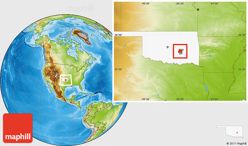 Maphill is a collection of map images. This image combines a physical map with the globe centered on ZIP code 74848. Use the buttons under the image to switch to different map types.