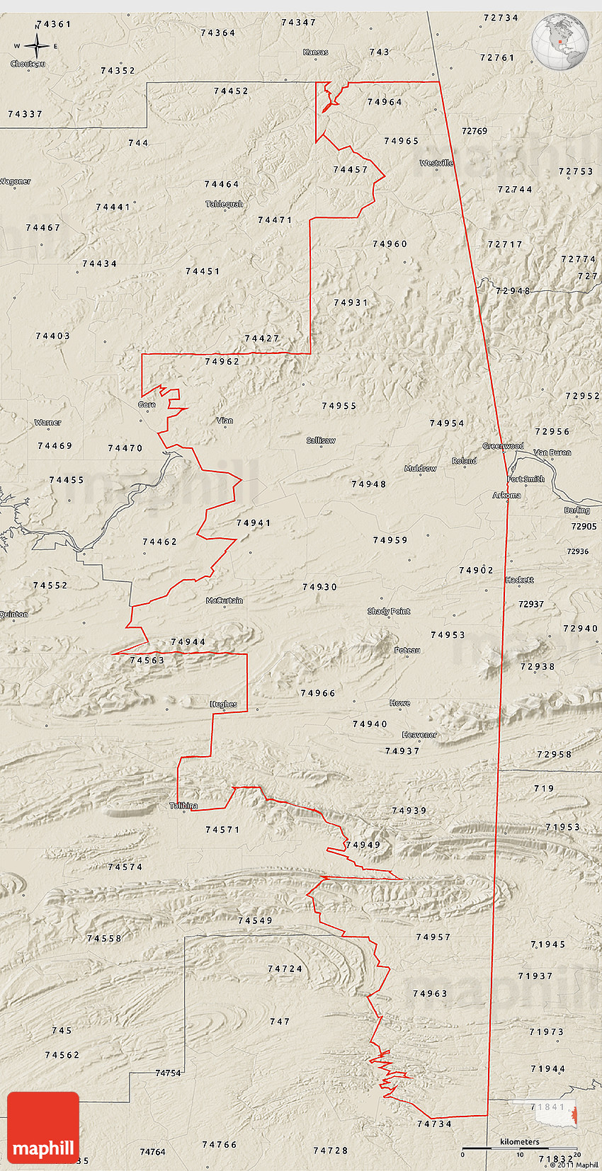 The 3D shaded relief map represents one of several map types and styles available. Look at ZIP codes starting with 749 from different perspectives.