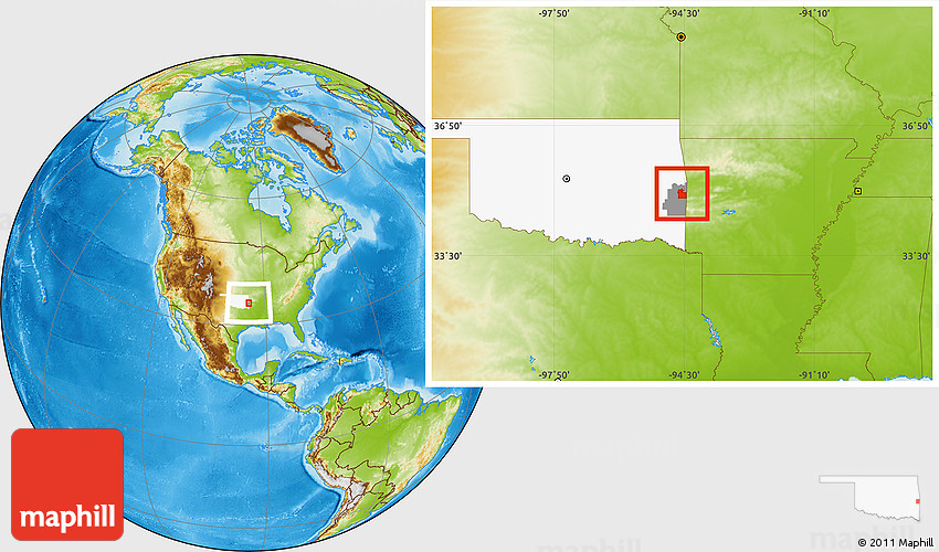 Maphill is a collection of map images. This image combines a physical map with the globe centered on ZIP code 74953. Use the buttons under the image to switch to different map types.