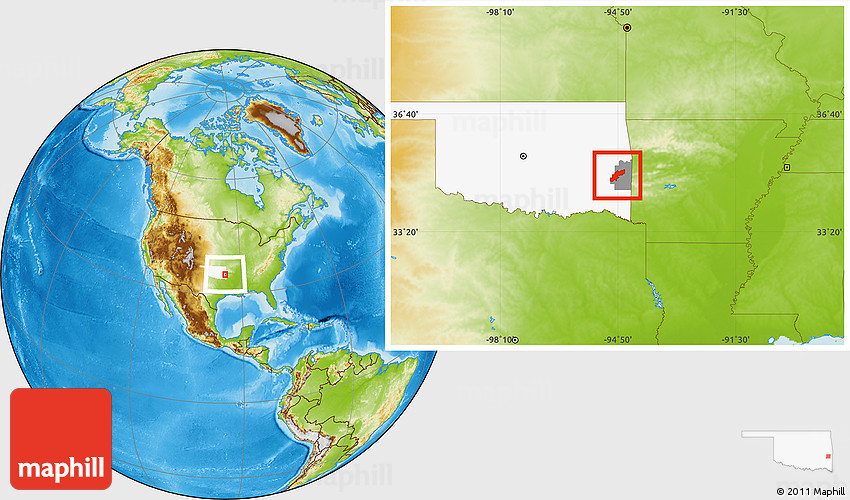 Maphill is a collection of map images. This image combines a physical map with the globe centered on ZIP code 74966. Use the buttons under the image to switch to different map types.