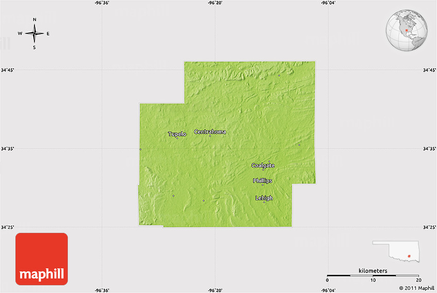 The flat physical map represents one of several map types and styles available. Look at Coal County, Oklahoma, United States from different perspectives.