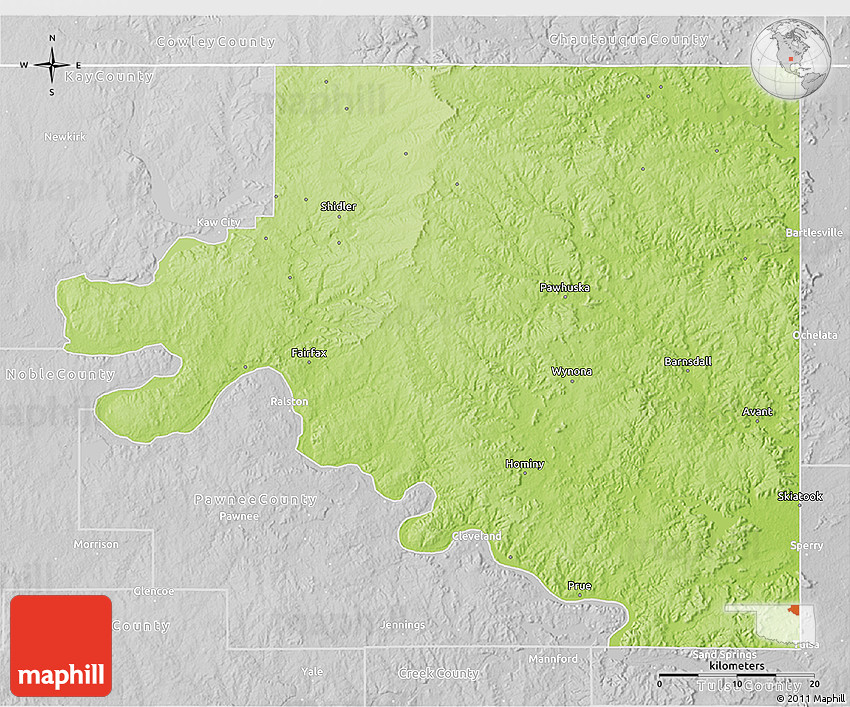 Physical map illustrates the mountains, lowlands, oceans, lakes and rivers and other physical landscape features of Osage County. Differences in land elevations relative to the sea level are represented by color.