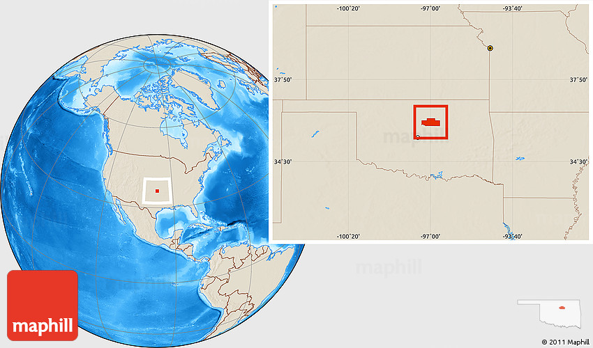 Maphill is a collection of map images. This image combines a shaded relief map with the globe centered on Payne County. Use the buttons under the image to switch to different map types.