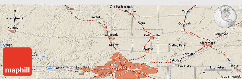 The panoramic shaded relief map represents one of many map types and styles available. Look at Catoosa, Rogers County, Oklahoma, United States from different perspectives.