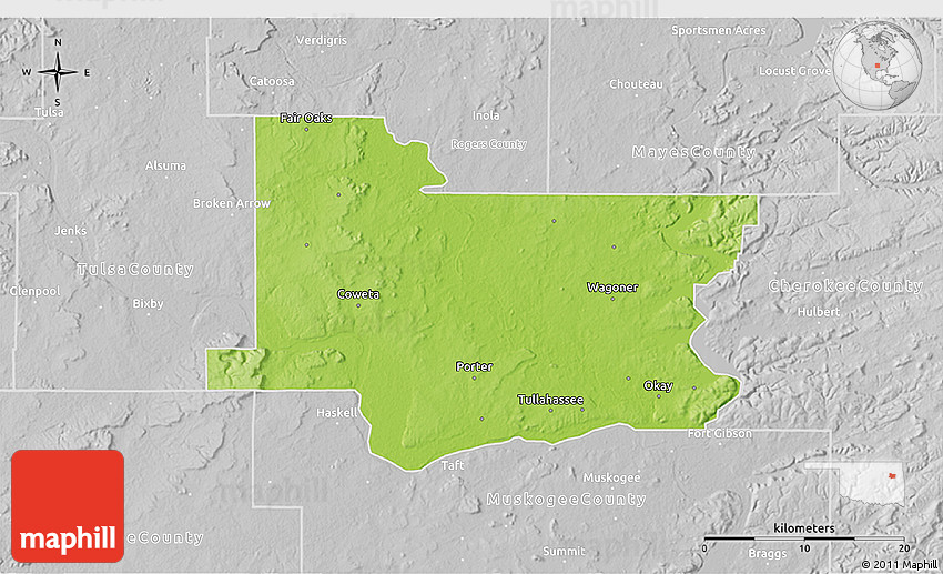 Physical map illustrates the mountains, lowlands, oceans, lakes and rivers and other physical landscape features of Wagoner County. Differences in land elevations relative to the sea level are represented by color.