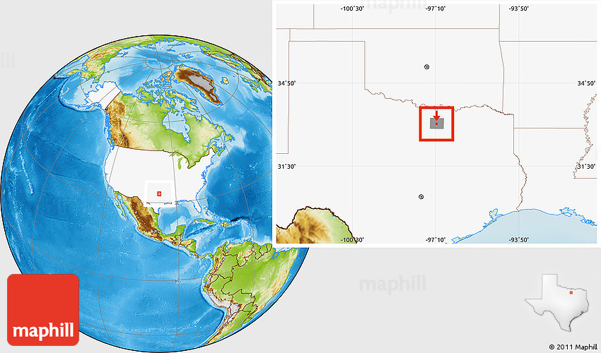 Maphill is a collection of map images. This image combines a physical map with the globe centered on ZIP code 76205. Use the buttons under the image to switch to different map types.