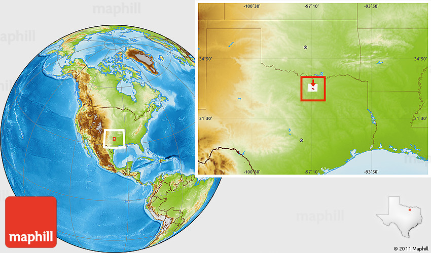 Maphill is a collection of map images. This image combines a physical map with the globe centered on ZIP code 76210. Use the buttons under the image to switch to different map types.