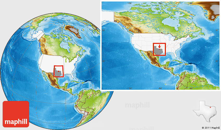 Maphill is a collection of map images. This image combines a physical map with the globe centered on ZIP code 76258. Use the buttons under the image to switch to different map types.