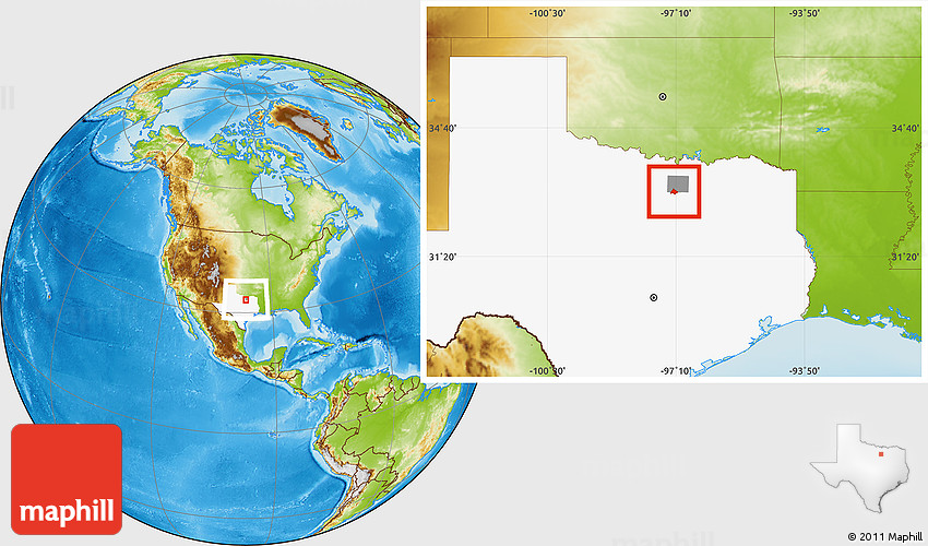 Maphill is a collection of map images. This image combines a physical map with the globe centered on ZIP code 76262. Use the buttons under the image to switch to different map types.