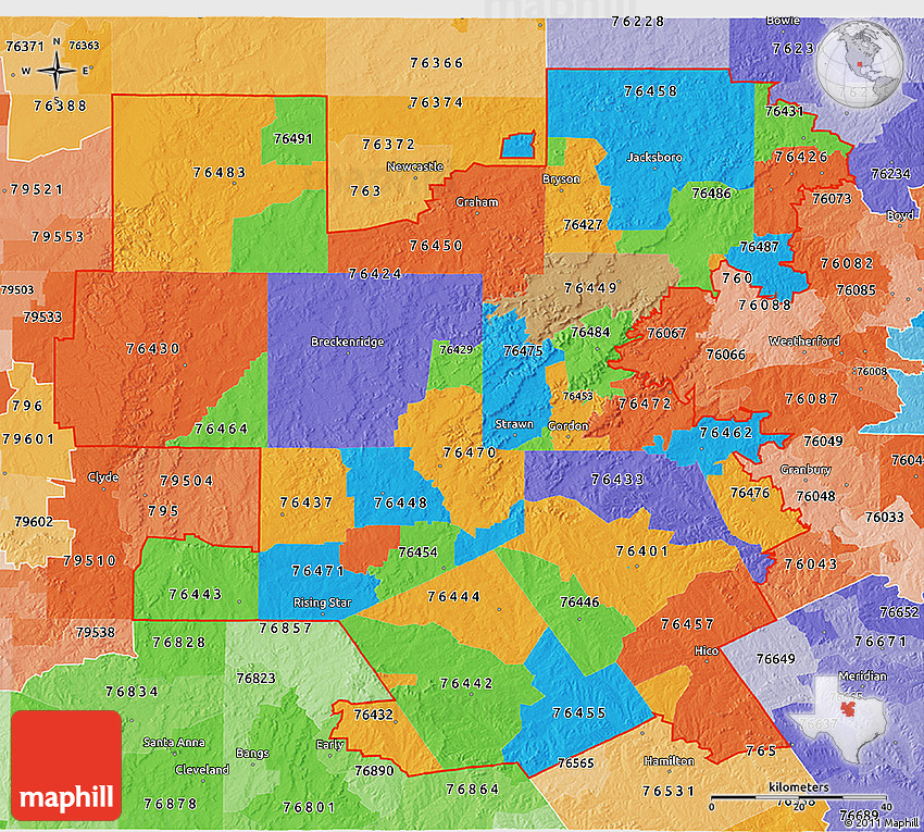 The 3D political map represents one of several map types and styles available. Look at ZIP codes starting with 764 from different perspectives.