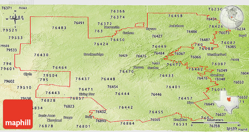 The panoramic physical map represents one of several map types and styles available. Look at ZIP codes starting with 764 from different perspectives.