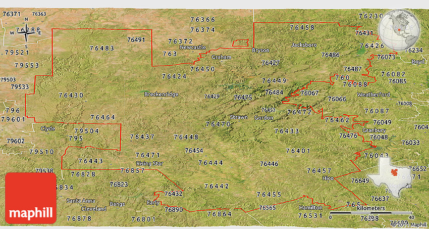 The panoramic satellite map represents one of several map types and styles available. Look at ZIP codes starting with 764 from different perspectives.