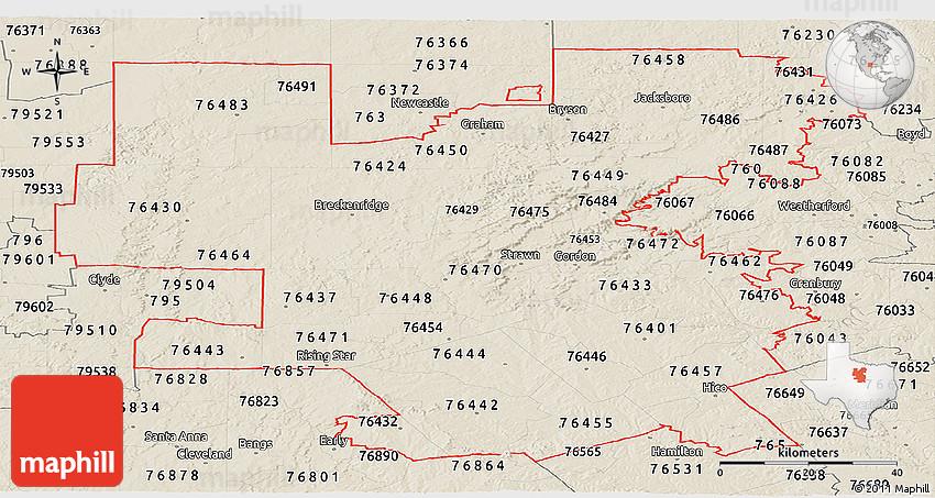 The panoramic shaded relief map represents one of several map types and styles available. Look at ZIP codes starting with 764 from different perspectives.