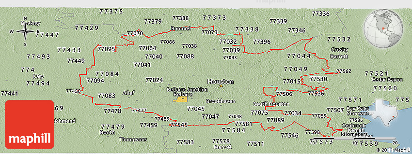 The panoramic savanna style map represents one of several map types and styles available. Look at ZIP codes starting with 770 from different perspectives.