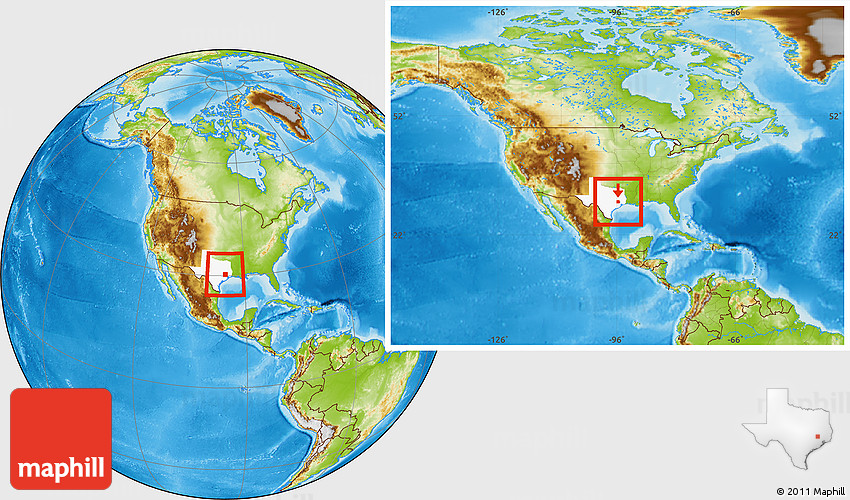 Maphill is a collection of map images. This image combines a physical map with the globe centered on ZIP code 77316. Use the buttons under the image to switch to different map types.