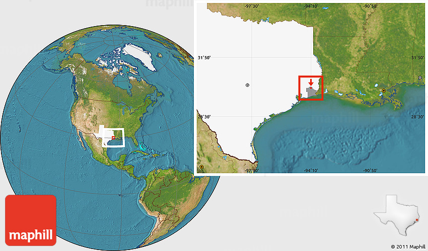 Maphill is a collection of map images. This image combines a satellite map with the globe centered on ZIP code 77706. Use the buttons under the image to switch to different map types.