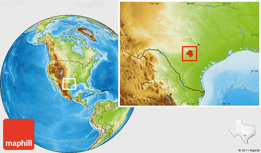 Maphill is a collection of map images. This image combines a physical map with the globe centered on ZIP codes starting with 782. Use the buttons under the image to switch to different map types.