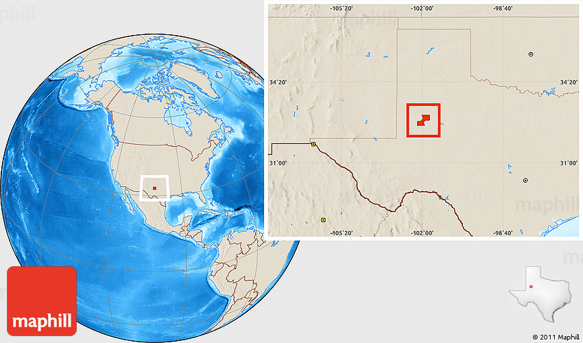 Maphill is a collection of map images. This image combines a shaded relief map with the globe centered on ZIP code 79331. Use the buttons under the image to switch to different map types.