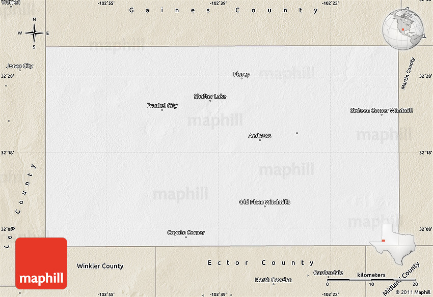 The flat classic style map represents one of several map types and styles available. Look at Andrews County, Texas, United States from different perspectives.