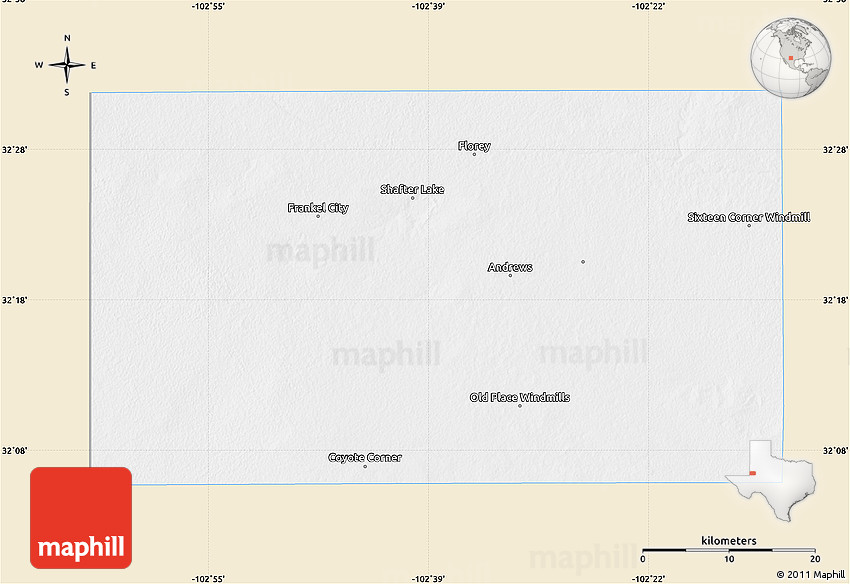 The flat classic style map represents one of several map types and styles available. Look at Andrews County, Texas, United States from different perspectives.
