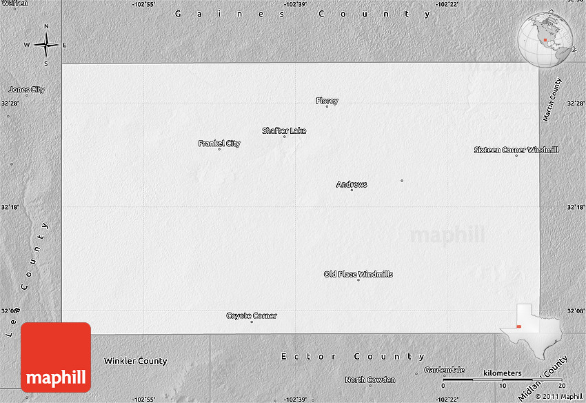 The flat gray map represents one of several map types and styles available. Look at Andrews County, Texas, United States from different perspectives.