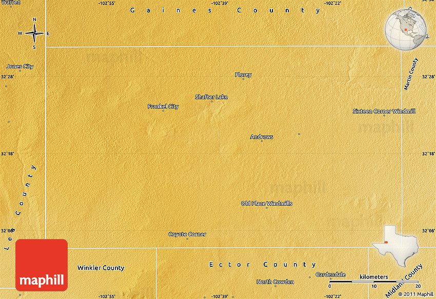 The flat physical map represents one of several map types and styles available. Look at Andrews County, Texas, United States from different perspectives.