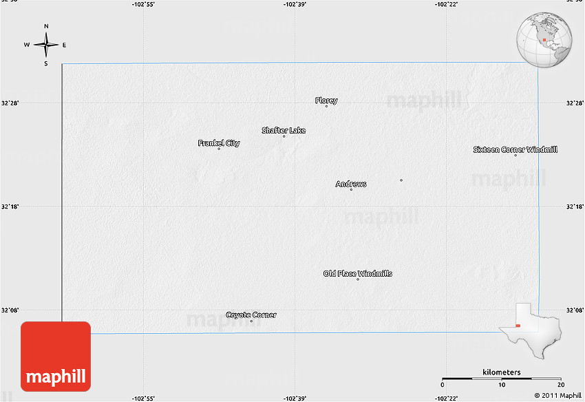 The flat silver style map represents one of several map types and styles available. Look at Andrews County, Texas, United States from different perspectives.