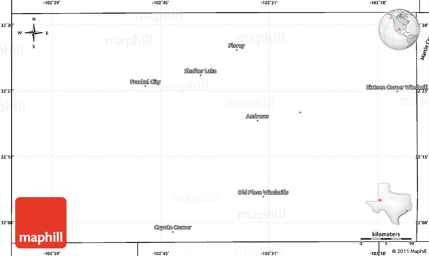 The simple blank outline map represents one of several map types and styles available. Look at Andrews County, Texas, United States from different perspectives.