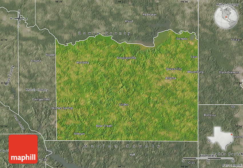 The flat satellite map represents one of several map types and styles available. Look at Cass County, Texas, United States from different perspectives.